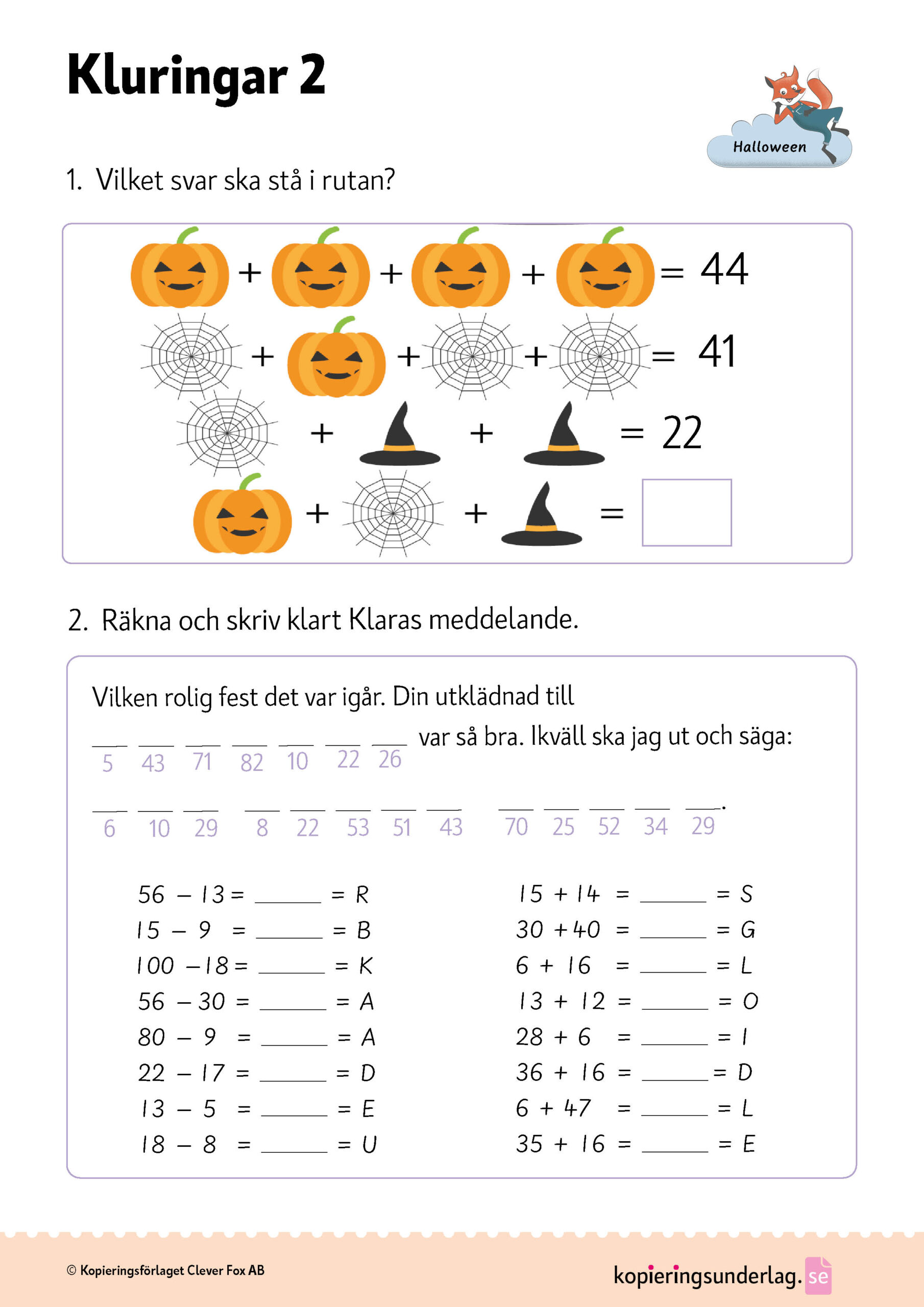 Matte med halloweentema, blad 2. Passar för årskurs 1-3.